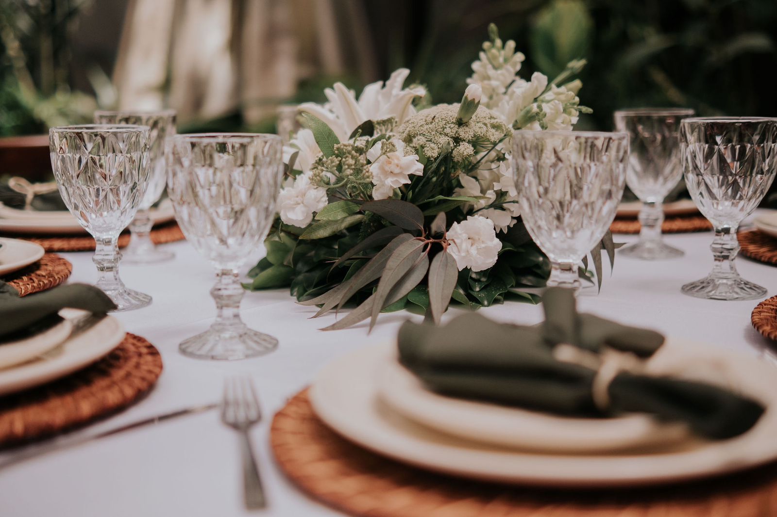 Decoração de mesa posta com toalhas, louças, taças, sousplats e guardanapos.